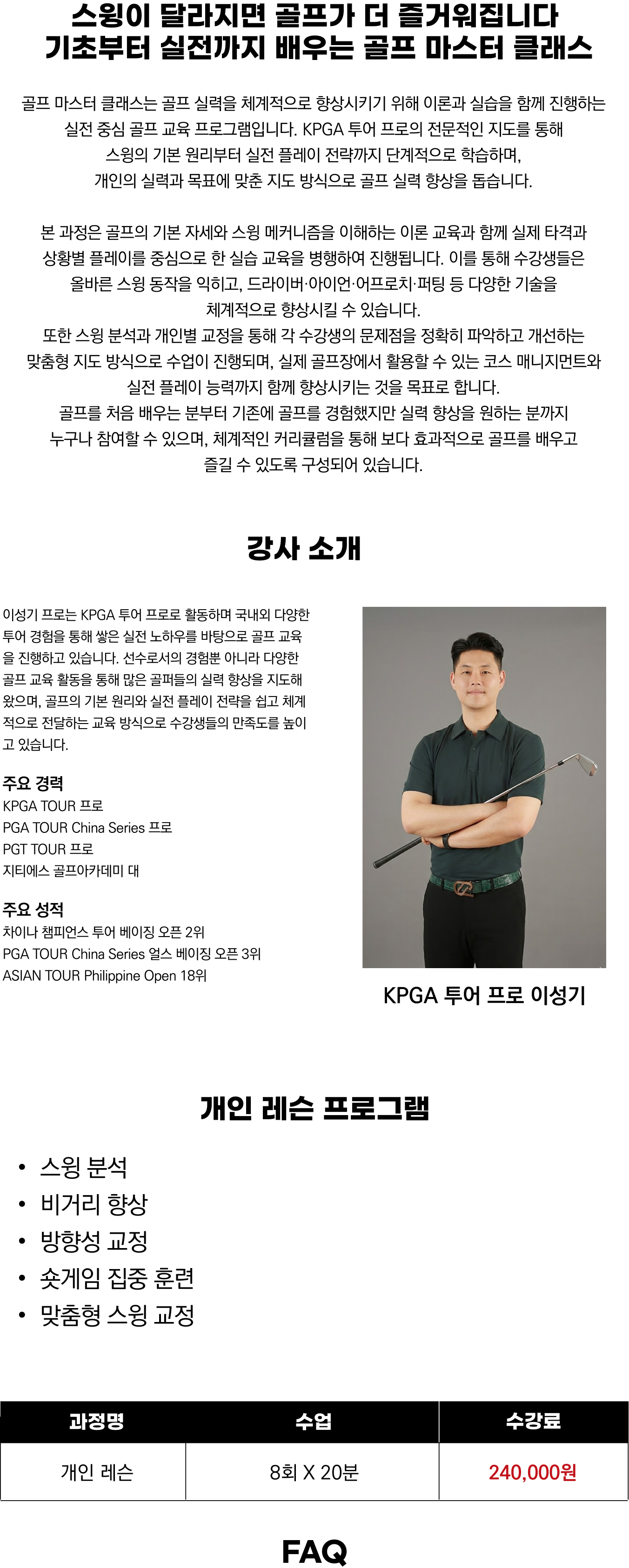 개인의 수준과 목표에 맞춰 스윙 교정, 비거리 향상, 아이언 정확도, 숏게임 기술, 퍼팅 교정 등 필요한 부분을 집중적으로 지도합니다.