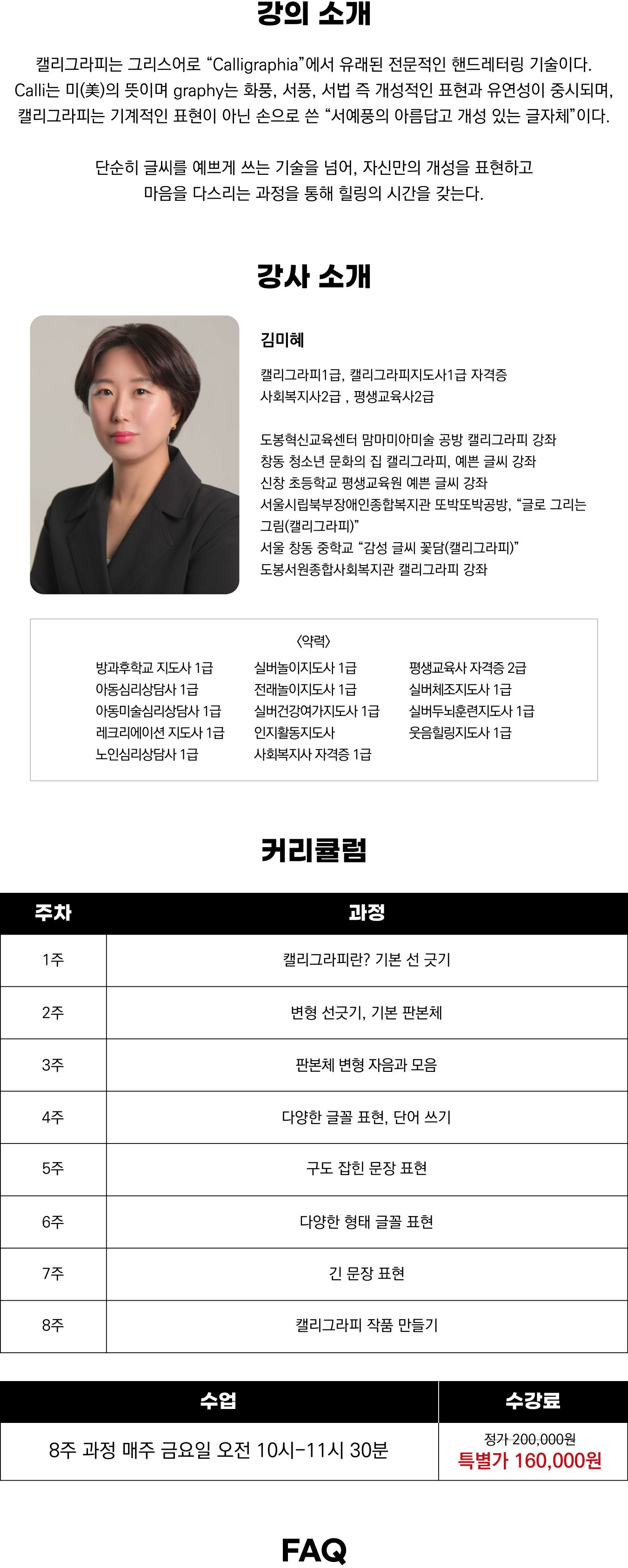 A: 저희 클래스는 전통 서예의 기본인 캘리그라피 전용 붓을 이용한 캘리그라피를 중심으로 다양한 재료와 소재를 사용한 한 한글 캘리그라피를 배우게 됩니다.