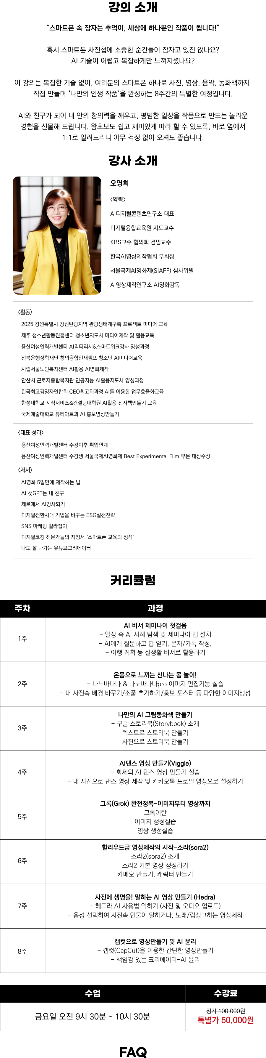 A. 일상생활과 창작 활동에 바로 사용할 수 있는, 가장 인기 있고 검증된 최신 AI 도구들을 배웁니다. 구글의 제미나이(Gemini)를 시작으로, AI 댄스 영상을 만드는 Viggle, 나만의 노래를 만드는 Suno, 전문가급 영상을 쉽게 편집하는 CapCut 등 다양하고 재미있는 도구들을 직접 체험하게 됩니다.