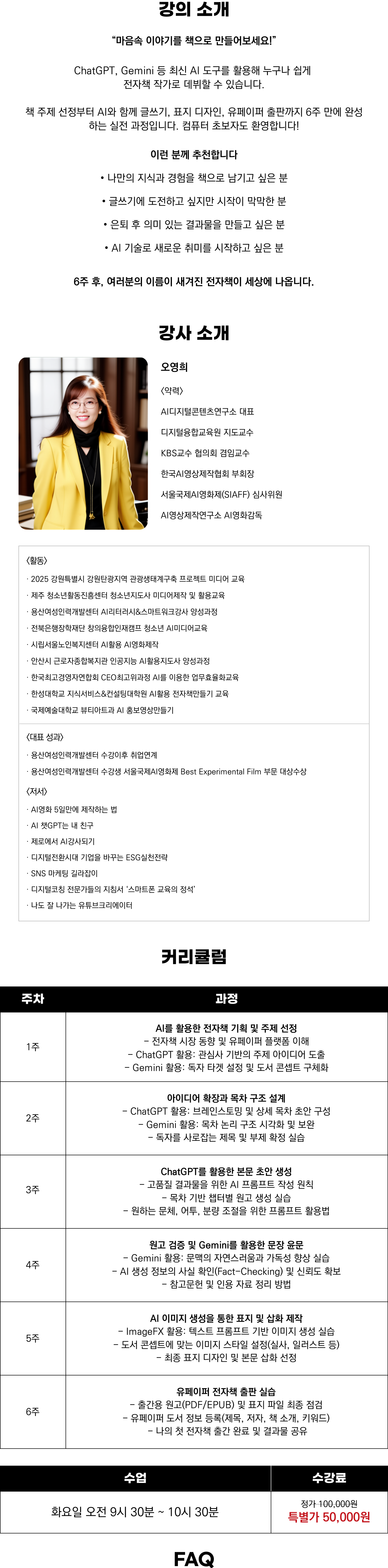 A. 네, 그렇습니다. 현재 AI를 '도구'로 활용하여 인간이 창의적으로 개입하고 최종 수정한 창작물의 저작권은 작가 본인에게 귀속됩니다. 본 과정에서 만드는 전자책은 수강생 본인의 기획과 최종 편집을 거치므로, 저작권은 온전히 작가님의 것이 됩니다.